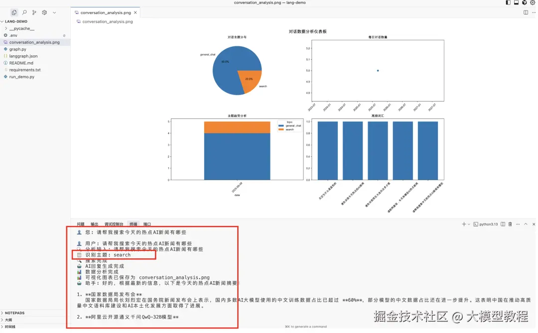 然后,我继续测试,换一个问题,问一个需要联网搜索的,例如我提问:请帮我搜索今天的热点AI新闻有哪些。然后他就会识别为【Search】主题,给我联网搜索生成结果,对数据进行分析后生成可视化图表。