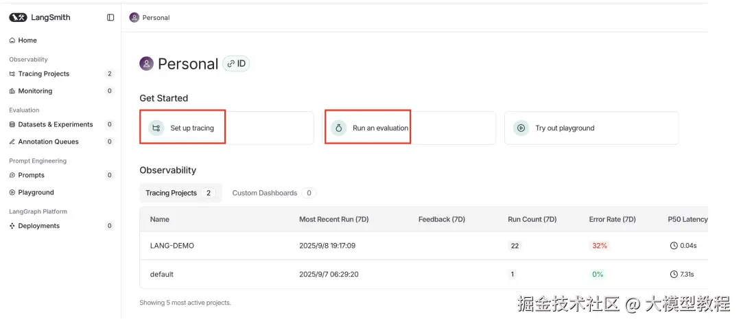 除此之外,现在你把这个页面关闭。然后再次进入到LangSmith的主页,点击【Tracing Projects】,也可以看到之前运行追踪的记录。