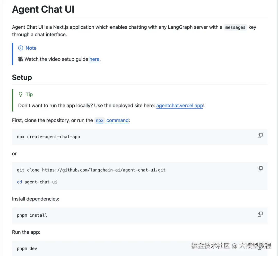 这一部分属于拓展部分,刚才我们写的Agent事实上是没有UI的。LangChain生态也是想到了这一点,所以官方还推出了一个Agent-Chat开源项目,可以快速构筑UI,关联到我们刚才本地创建的智能体。