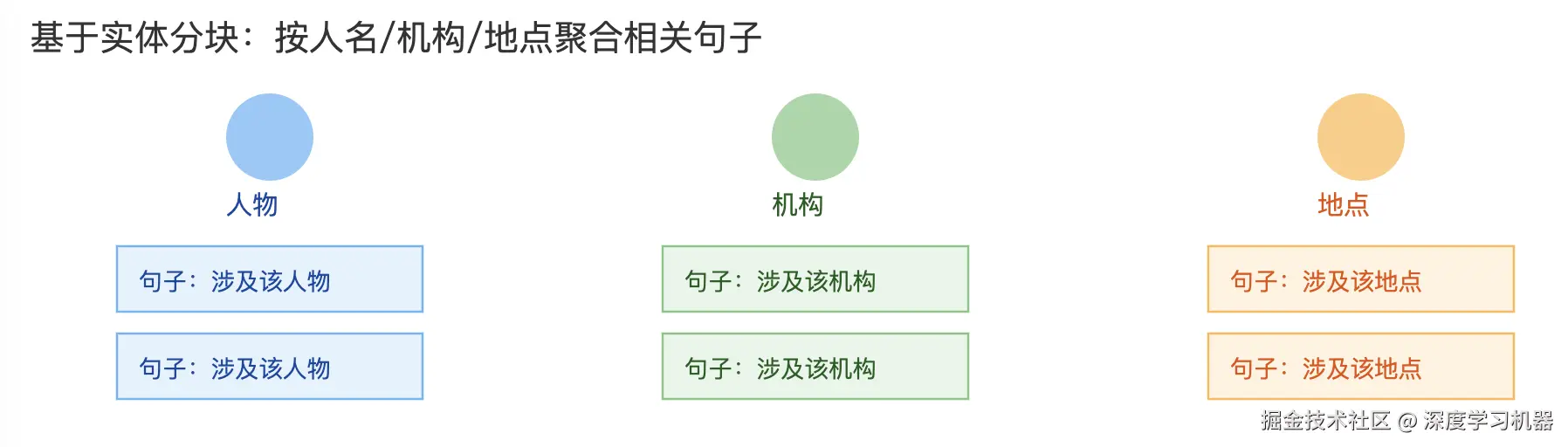 先做命名实体识别,再按实体把相关句子聚到同一块里,而不是只按原文顺序切。