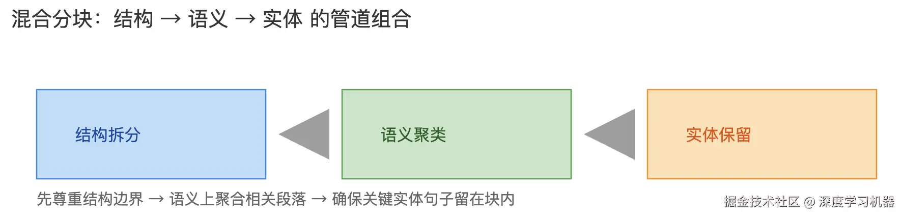 从名字就可以看出来,可以把多种分块策略组成Pipeline:先按结构拆分,再做语义聚类,最后做实体保留。这样能兼顾结构、语义和实体三方面的优势。