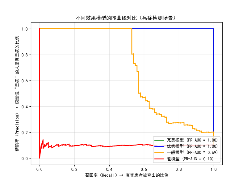 PR 曲线的横轴是召回率(Recall) ,纵轴是精确率(Precision) 。它专注于 "阳性样本" 的表现,特别适合样本极度不均衡的场景(比如罕见病:1 万个样本里只有 10 个患者)