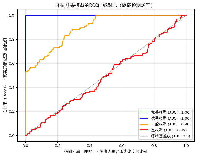 - AUC=1:完美模型(零误诊、全查全),现实中几乎不存在。