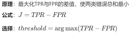 而在统计学中,两类错误代价相等的情况下,我们也会使用Youden指数(J统计量)来 寻找分类的概率阈值: