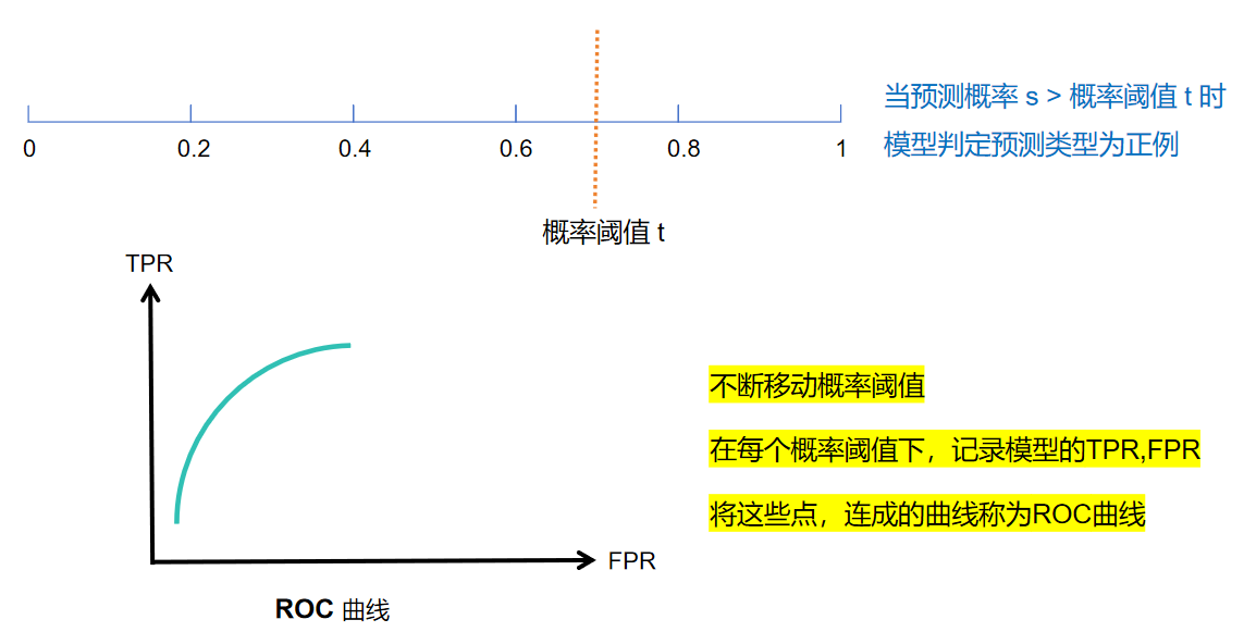 ROC 曲线的横轴是假阳性率(FPR) ,纵轴是召回率(Recall)。它的本质是:通过调整模型的 "判断阈值"(比如模型认为概率≥0.5 算阳性,调整这个 0.5),画出不同阈值下 FPR 和 Recall 的对应关系。