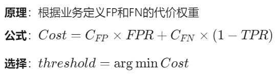 而在一些业务错误代价严重不对称的场景(如医疗,金融),常使用代价敏感法来寻找阈值: