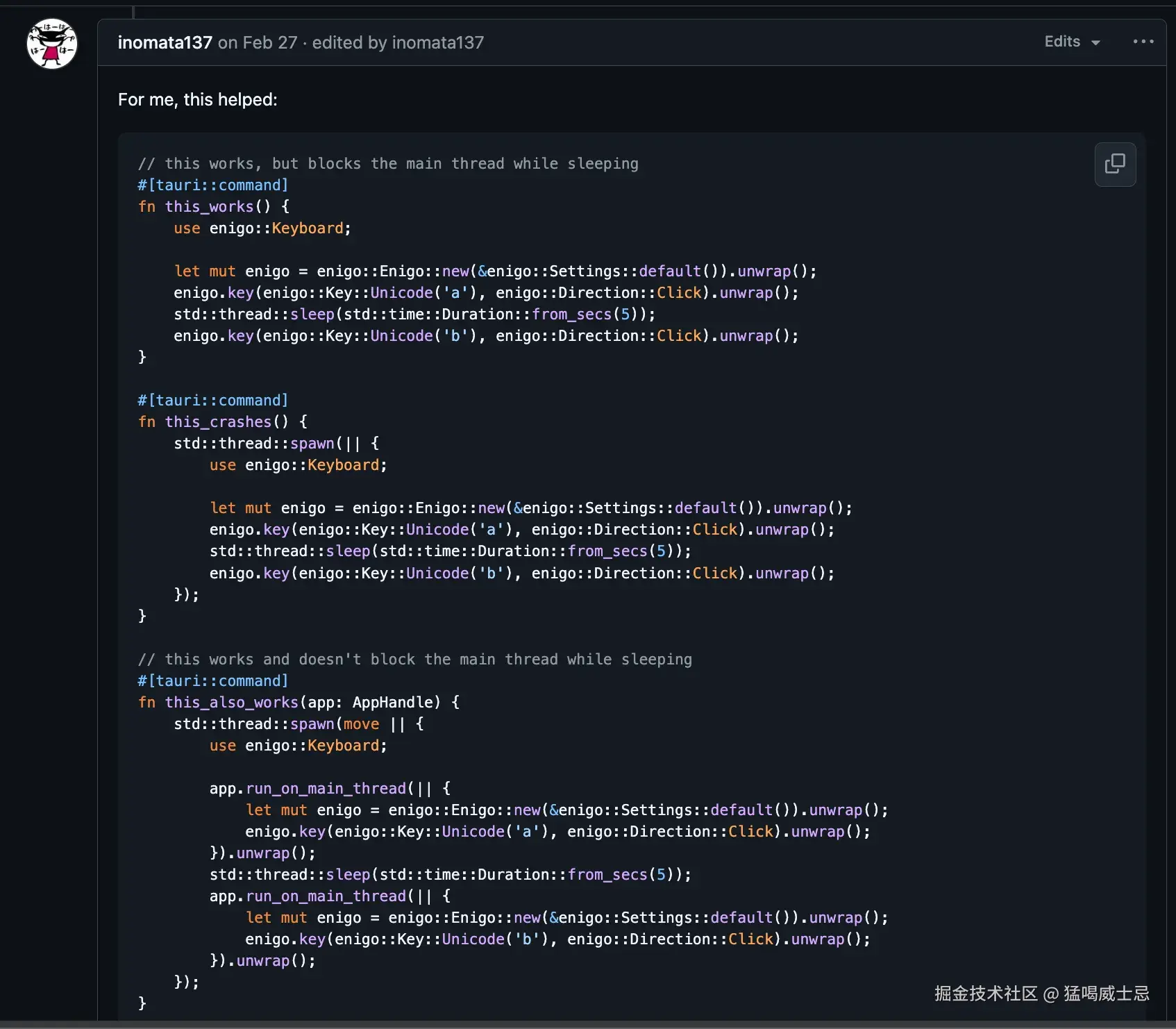 他首先甩出了两个会崩溃的案例代码,然后注意看他的第三段代码,他直接就是一个 run_on_main_thread 让enigo这小子 直接就是说,在tauri的 主线程 中执行~