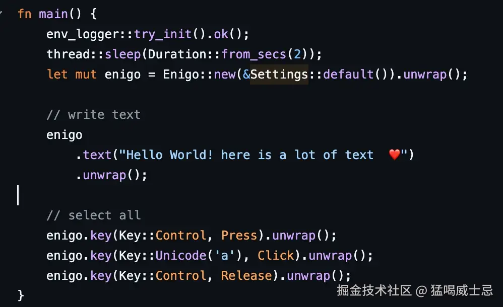 这应该是一个非常非常标准使用 enigo 的代码(我觉得),几乎和官方的example中的代码没啥区别~吧?主要是这玩意儿在WIndows上跑一点问题都没有。
