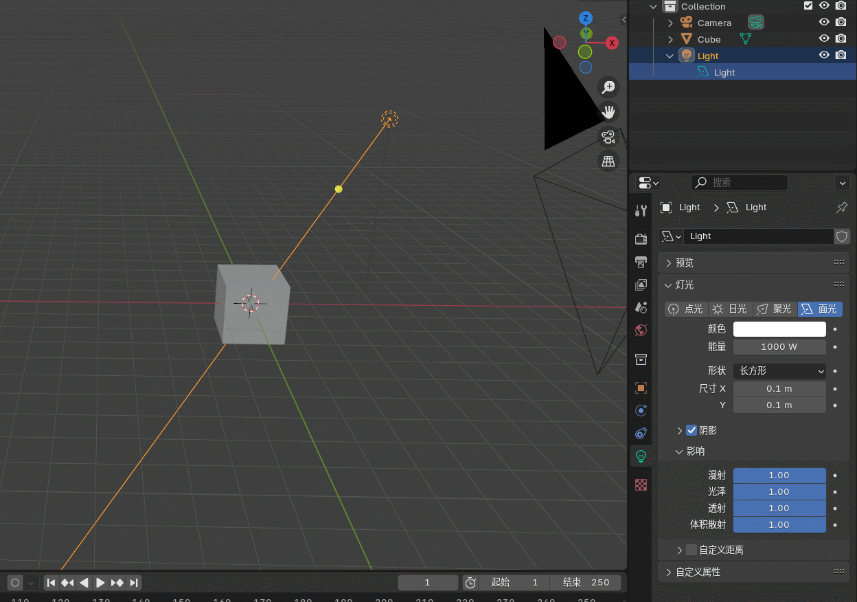 - 方向(Normal):光线主要从平面的"正面"(法线方向)发射,旋转平面可改变光照方向。