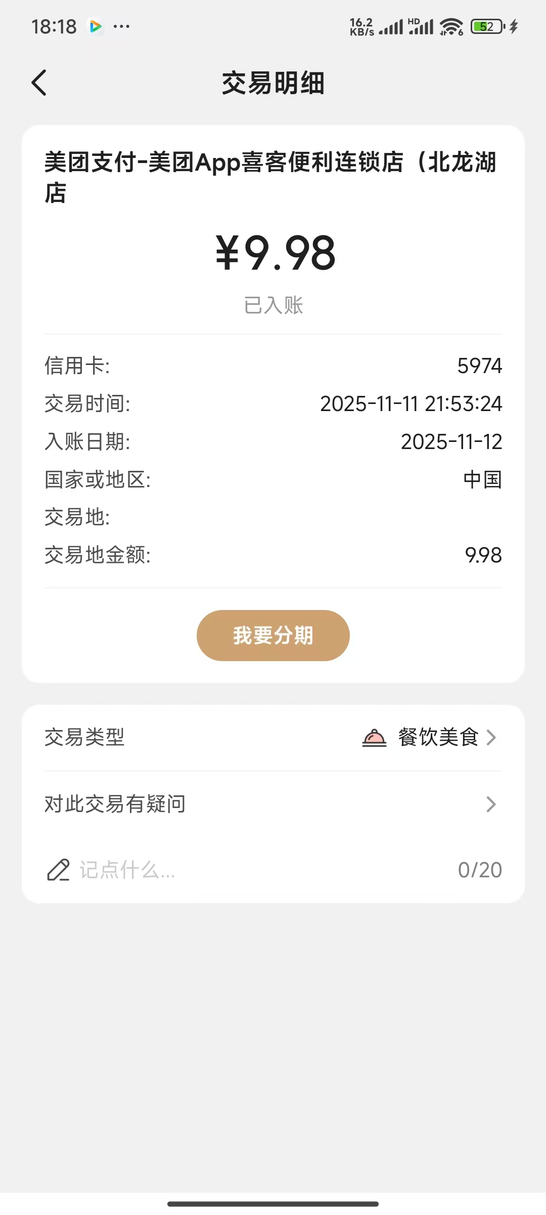 一个9.9的消费宝宝,9.9在2025年11月12日20:39做了一笔时间消费,占用了信用总额度。此时状态是入账中宝宝,滴滴滴滴滴,在第二天2025年11月12日 13:59此时9.9的消费变成已入账,这时候9.9宝宝统计到未出账单的金额中;对滴滴滴滴滴到了2025年11月21日过了零点9.9的产生了已出账单,然后再12月9号之前正常还款这样就结束了9.9的一生;但是如果过了12月9号就回产生利息了;这里还可以再12月9号之前进行最低还款,剩余付利息就行;或者还可以再12月9号进行分期还款,这里可以看到分期还款计划以及本金和利息。还有还有就是大家可以在消费完再没出账单之前进行提前还款也可以了 。