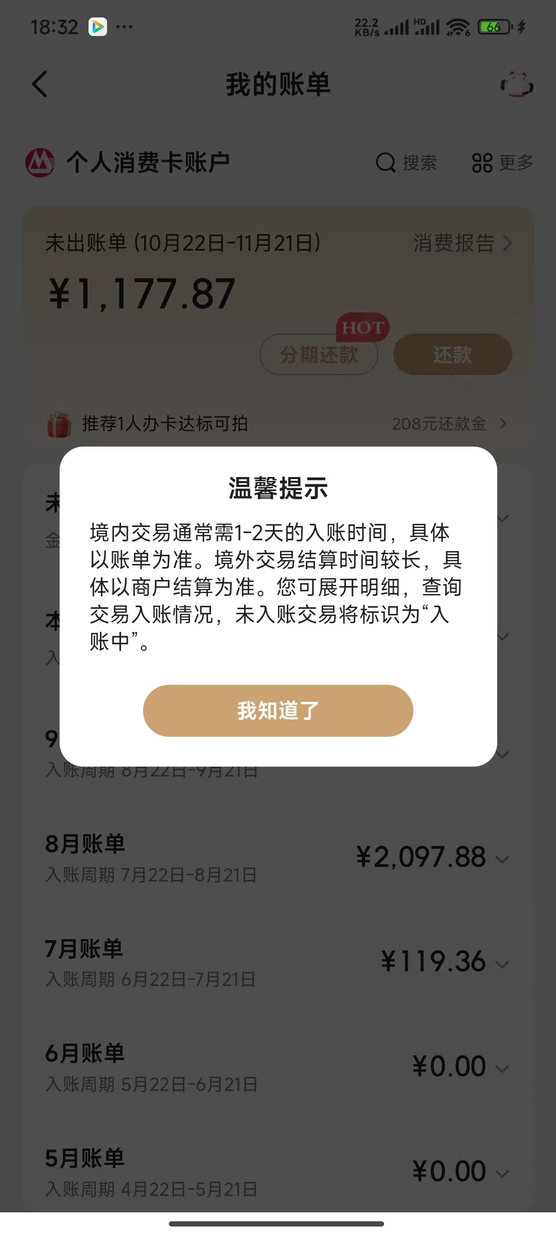 发稿日期2025年11月12日,这里看图(3)11月账单,账单周期是(10月22日至11月21日),在这个账单周期内统计的金额且目前还未到11月21日最后天,这里的账单通常为未出账单,(这里统计的1177.87是统计的未出账单中已经入账的部分,后续说明 已入账和入账中)大白话就是没有到21号之前的消费都是未出账单,过了21号统计的就是11月份的已出账单,后续消费自动算入下一个循环12月的账单