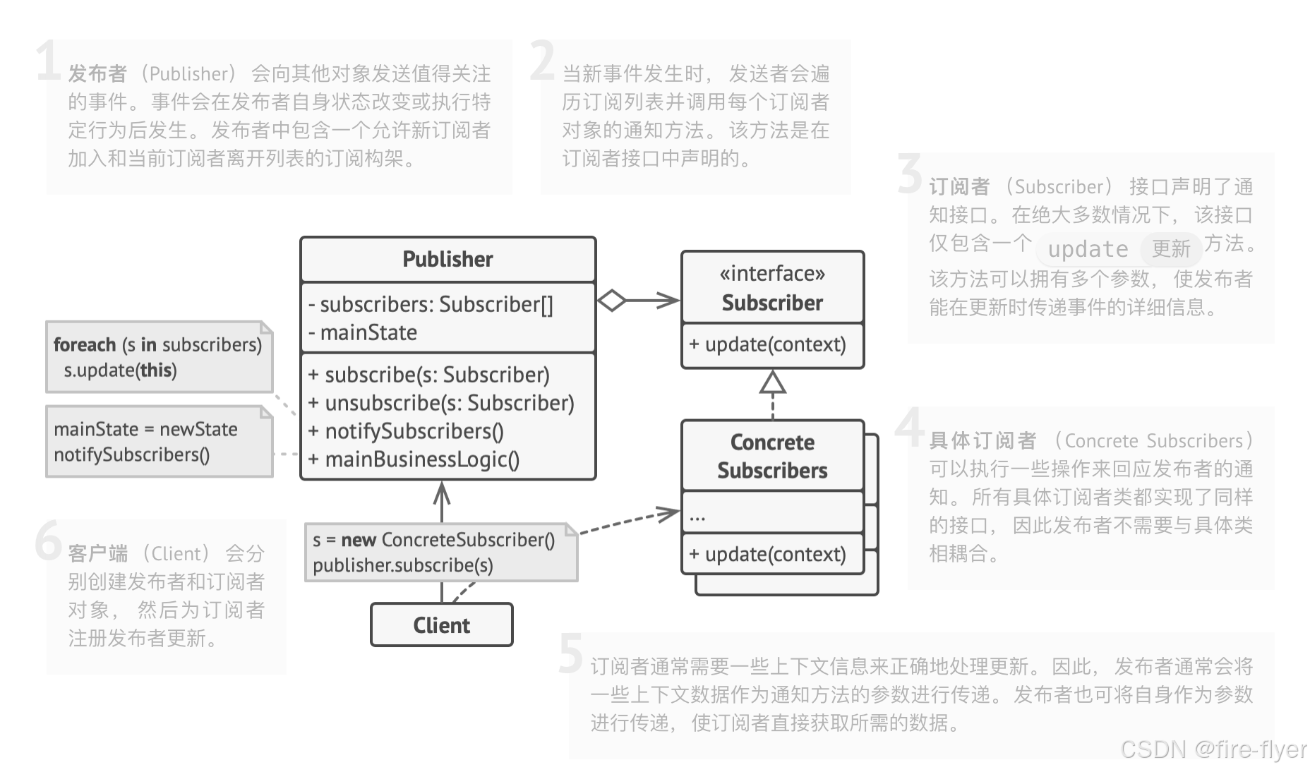 - 说明:把观察者和被观察者解耦,被观察者不直接依赖观察者,只通过通知接口告知状态变化。