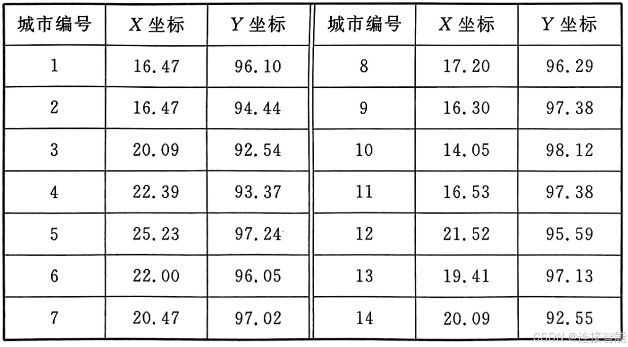 本节以求解14个城市的TSP问题为例,14个城市坐标如下: