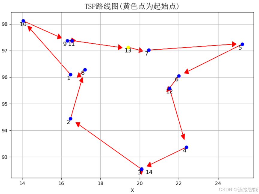 TSP(Traveling Salesman Problem)旅行商问题,可简要描述为:求解走完若干个城市的最短路线,要求除出发城市外每个城市只经过一次,且最终回到出发的城市。