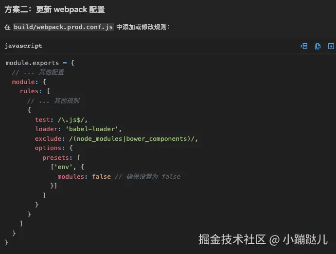 如果是自己写的代码,可以在代码中查找并修改,统一项目中的模块语法规范即可。如果是第三方库出现的问题,就可以用本文中的方法解决,先尝试检查 babel 配置并确保 modules: false 设置正确,这通常能解决大部分此类问题。