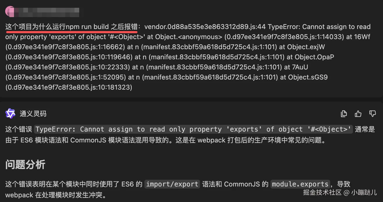 核心原因正如分析所示:在同一模块中同时混用了 ES6 的 import/export 语法与 CommonJS 的 module.exports 语法,导致 webpack 处理模块时出现冲突。这是 webpack 打包后,生产环境中较为常见的问题。