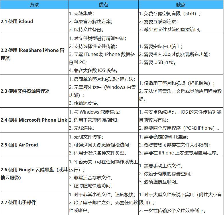 在 Windows 电脑上管理 iPhone 文件,依赖 iTunes 已不再是过去式。您可以使用 iCloud 通过无线方式同步和访问 iPhone 文件;使用iReaShare iPhone Manager通过 USB 接口在电脑上预览、传输和整理 iOS 数据;或者利用 AirDroid、Google Drive 等其他工具,轻松地在电脑上查看和复制 iPhone 文件。