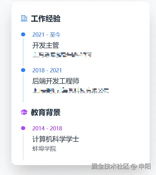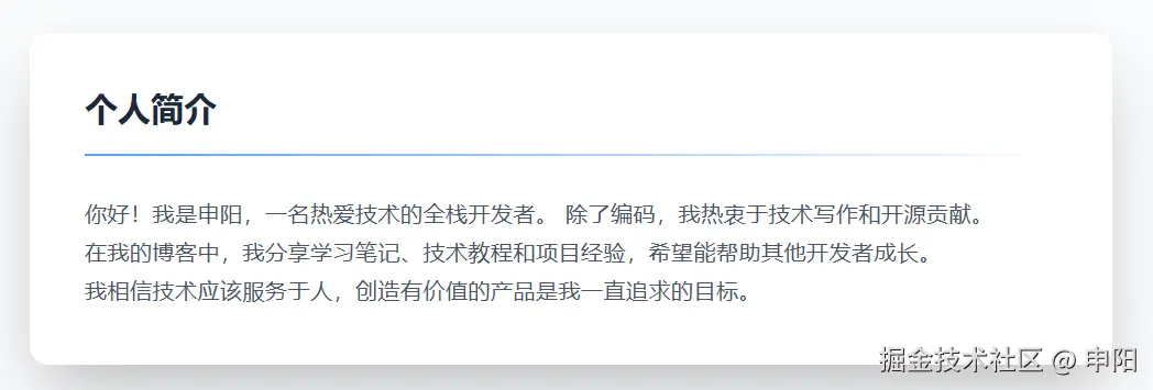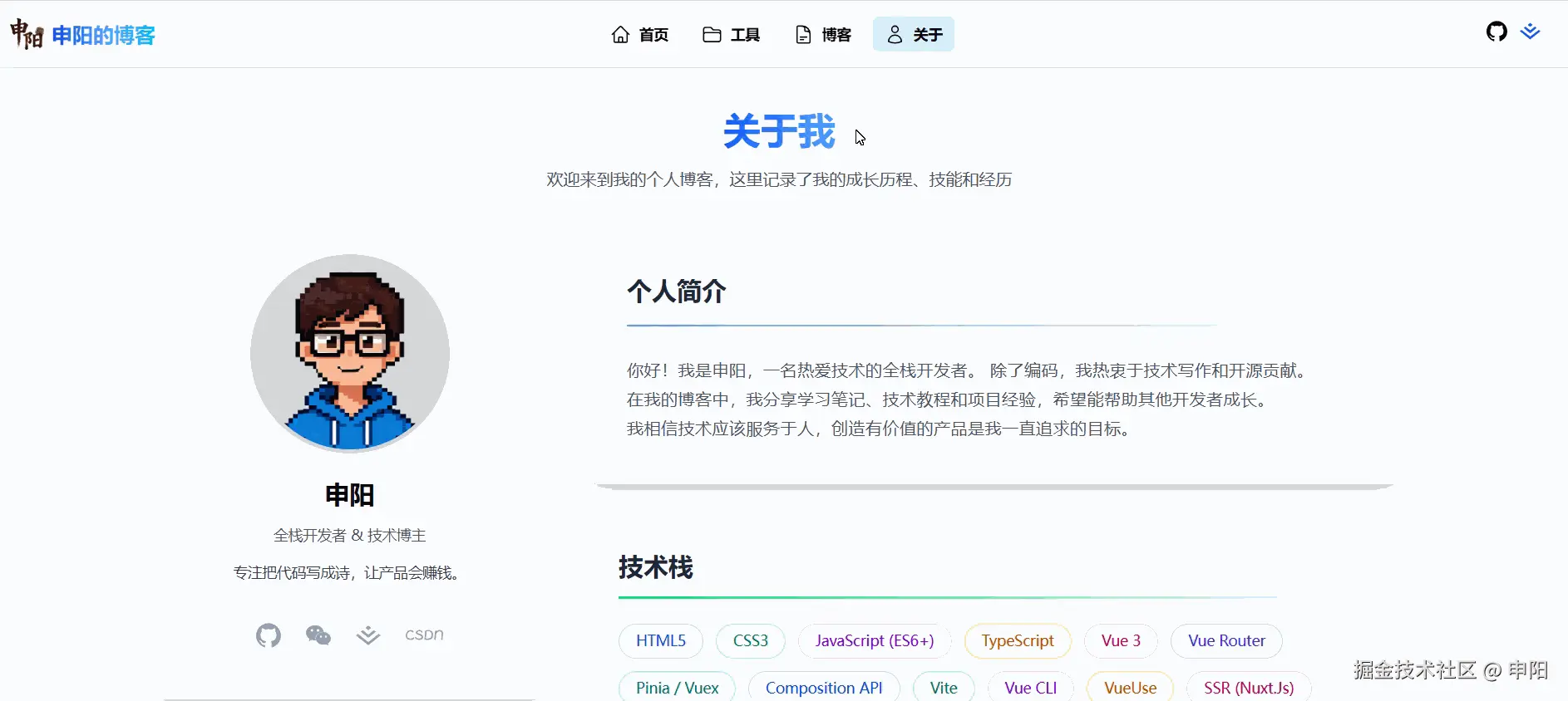 在个人博客项目中,"关于我"页面是访客了解博主的重要窗口。一个设计合理、内容丰富的关于我页面不仅能展示个人专业能力,还能增加博客的亲和力和可信度。当然你可以完全 DIY 这个模块,或者也可以参考我的设计,这个页面主要包含信息卡片、个人简介、技术栈、工作经历和教育经历等模块。