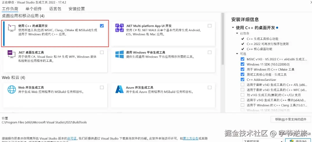 在 Windows 上编译 Rust 和一些原生 Node.js 模块需要 C++ 构建工具。 访问官网:visualstudio.microsoft.com/zh-hans/vis... 下载"Microsoft C++ 生成工具"。在安装程序中,只用勾选"使用 C++ 的桌面开发",然后安装即可。