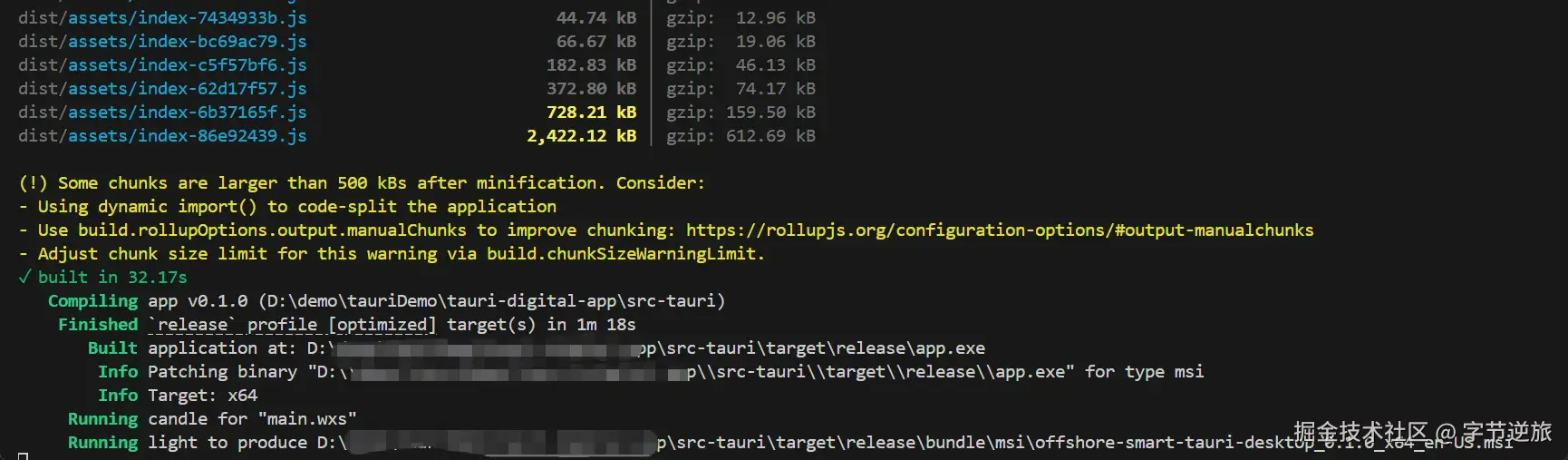 下面这张图是执行npm run tauri:build后的效果,它会先执行npm run build,构建本地的打包文件,然后再从dist文件夹下面获取静态文件并打包为最终包。
