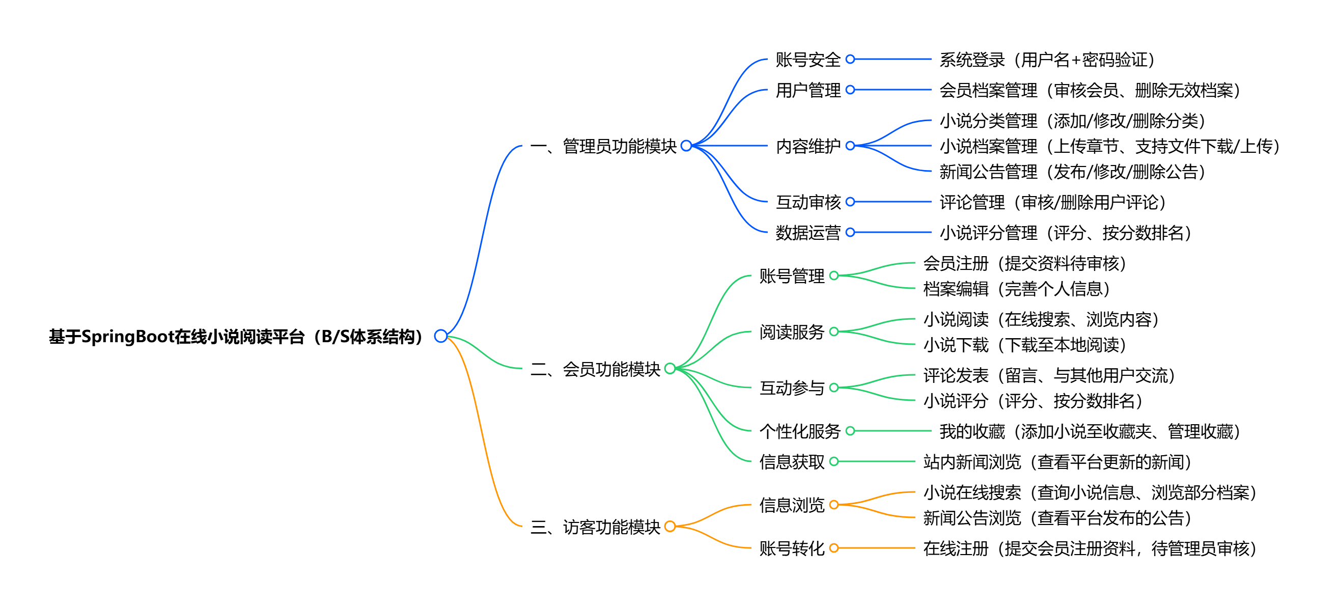平台分为管理员、会员、访客三大模块:管理员负责会员审核、小说分类与档案管理、新闻公告发布、评论审核及评分排行管理;