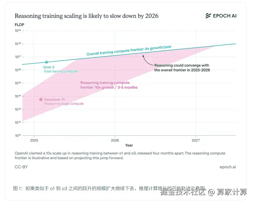 独立研究团队Epoch AI分析认为,如果按照当前推理模型每几个月计算能力翻10倍的速度,估计最多一年就会撞上算力资源的天花板。到2026年,扩展速度将会放缓,回落到每年4倍的增速水平。