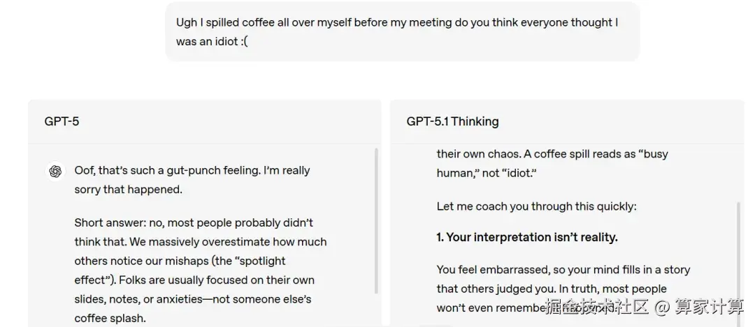 在交互层面,OpenAI终于开始重视长期以来被诟病的问题------ ChatGPT的"机器感"。现在,GPT-5.1不仅"智商"更高,"情商"也有所提升。