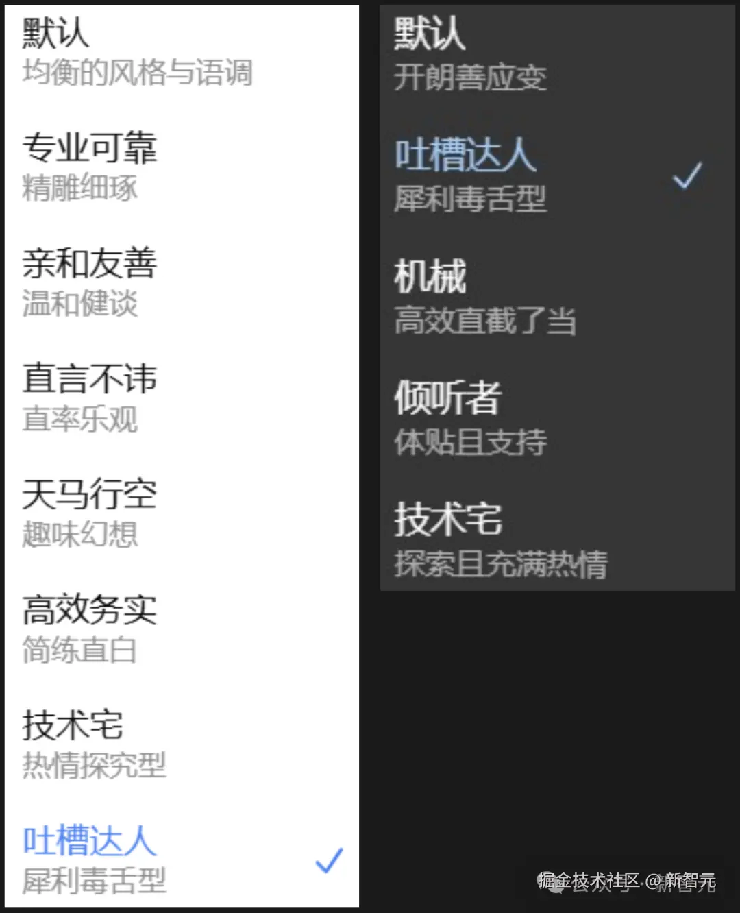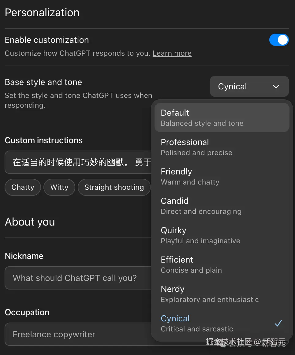 从专业可靠(Professional)、亲和友善(Friendly),到直言不讳(Candid)、天马行空(Quirky),再到吐槽达人(Cynical)、高效务实(Efficient)、技术宅(Nerdy),都能任意挑选**。**