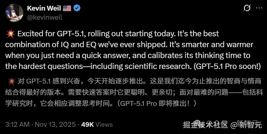 正如科学副总裁 Kevin Weil 所言,GPT-5.1 是 OpenAI 迄今为止推出的最完美的组合,「智商与情商双双在线」!