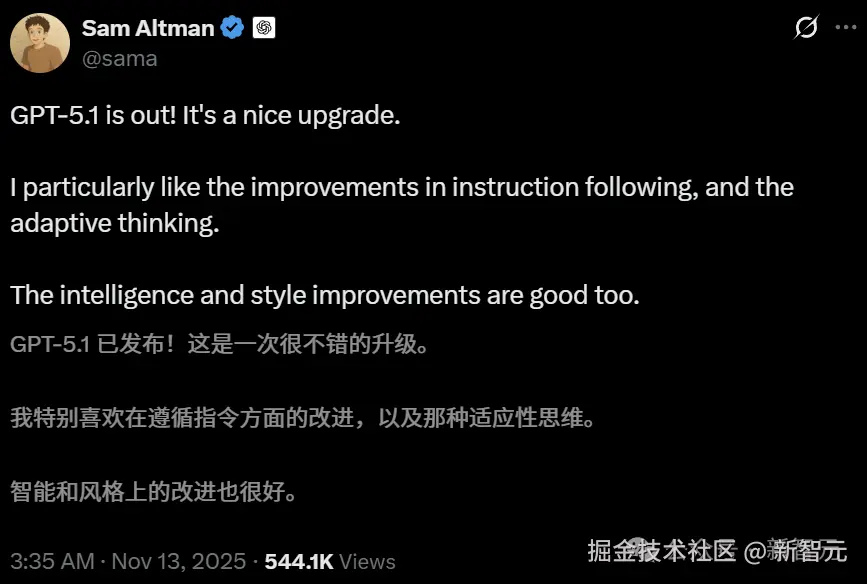 奥特曼激动表示,GPT-5.1 升级给力,尤其是指令遵循和自适应思考的改进。