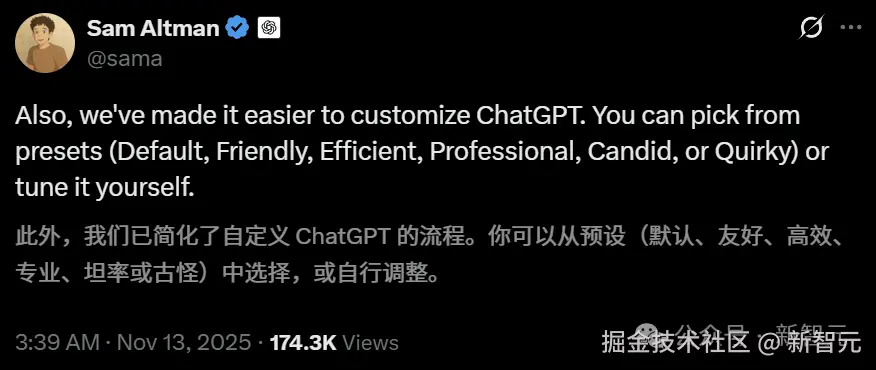 总而言之,GPT-5.1 重大更新和新的自定义选项,是 OpenAI 迈向一个更懂你、更智能、更健谈、更能适应个人偏好的 ChatGPT 的重要一步。