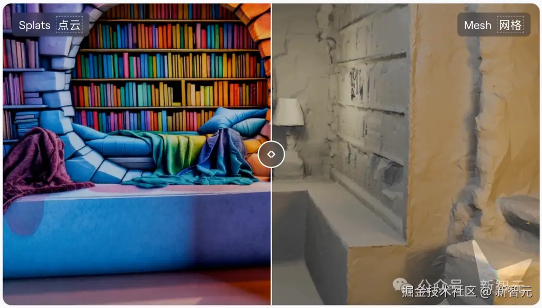高斯溅射点是 Marble 世界最高保真度的呈现方式。它将 3D 场景表示为大量半透明粒子集合。