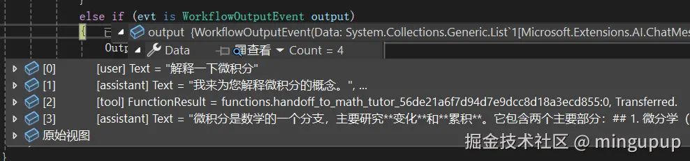 OutputText += $"[调用函数 '{call.Name}',参数: {JsonSerializer.Serialize(call.Arguments)}]";