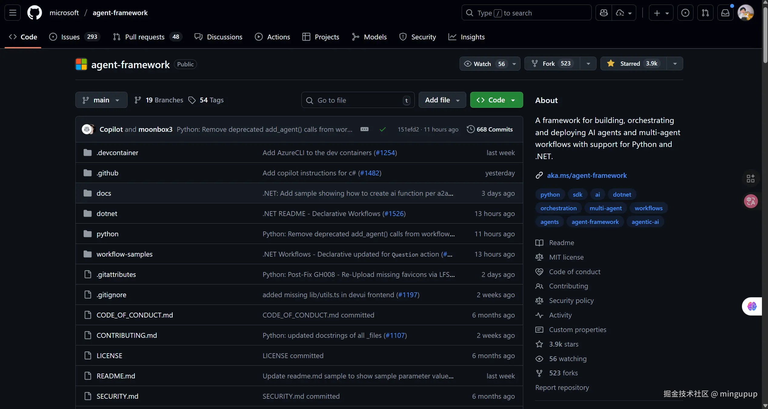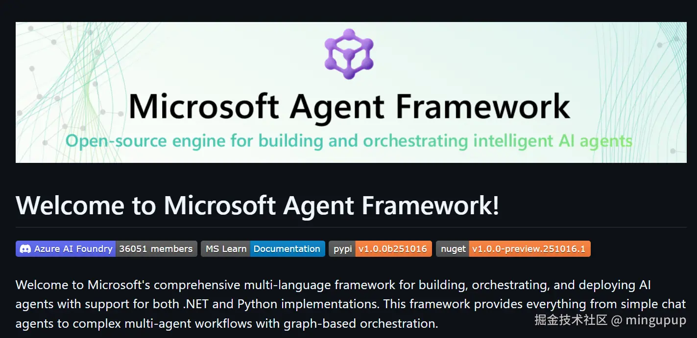 GitHub上的简介是:"一个用于构建、编排和部署AI代理及多代理工作流程的框架,支持Python和.NET。"