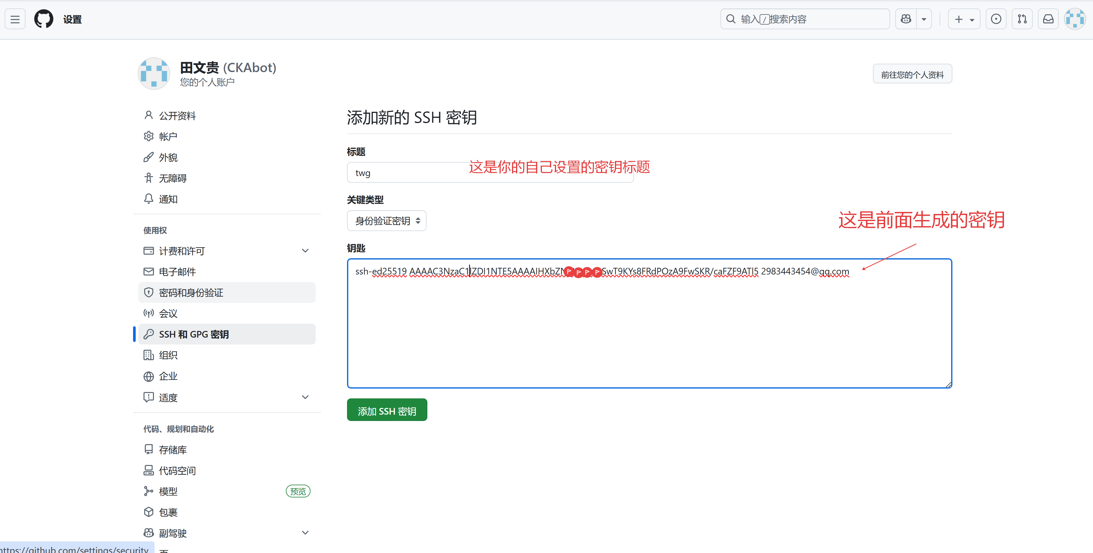 # 4. 登录GitHub → Settings → SSH and GPG keys → New SSH key