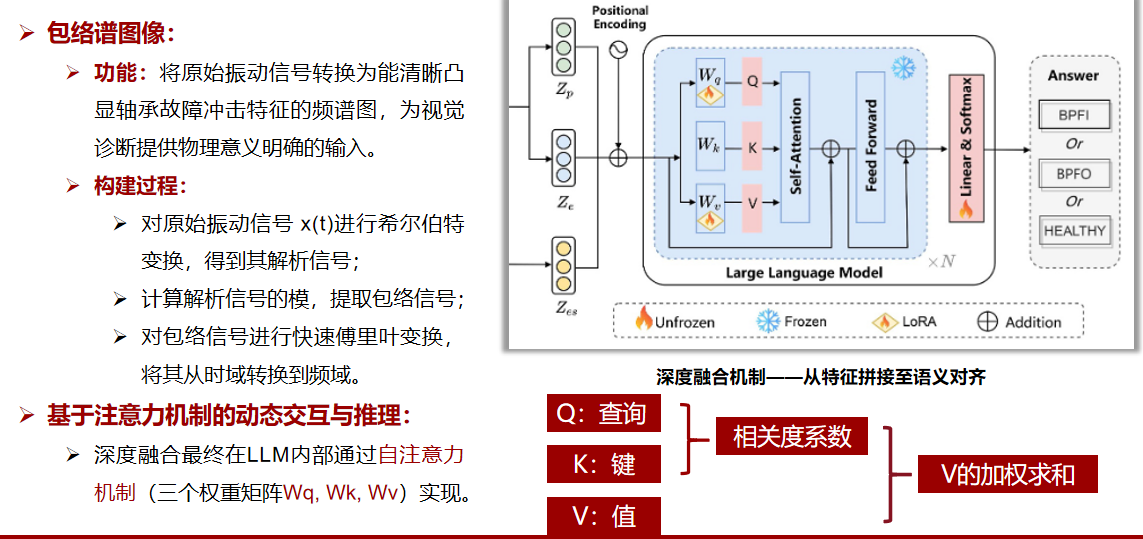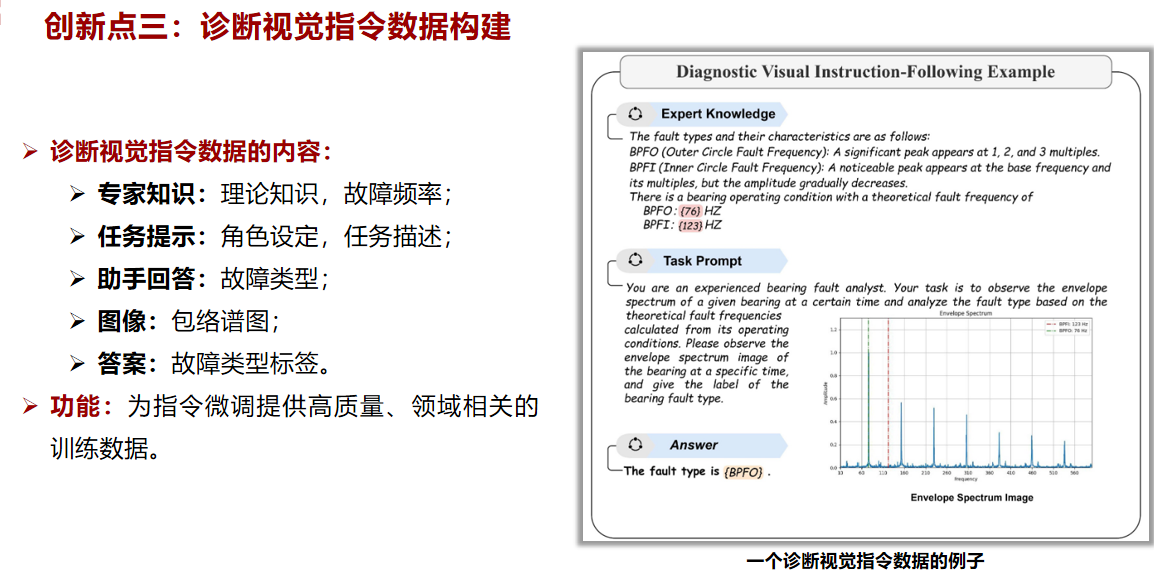 - 外行定义:一项让AI模型根据给定的图像内容来回答问题的任务。在本文中,故障诊断被构建成一个VQA任务,即向模型(DiagLLM)展示一张包络谱图像并提出问题("这是什么故障?"),模型需要给出答案(如"外圈故障")。