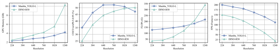 图4:DINO-R50和Mamba YOLO-L在GPU内存效率和mAP方面的比较,随着输入图像分辨率的增加。DINO需要更高的分辨率来维持高mAP,并且在GPU内存和FLOPs方面都显示出二次增长趋势。相比之下,MambaYOLO在GPU内存需求上保持线性增长,并在较小的640x640分辨率下实现了最高性能,且FLOPs更少,推理速度更快。