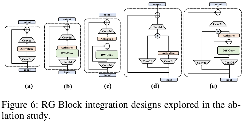 RG Block结构消融研究 RG Block通过将全局依赖性和全局特征逐像素传递来捕获逐像素的局部依赖性。RG Block使用多分支结构对通道维度进行建模,解决了SSM在序列建模中感受野不足和图像定位弱的局限性。关于RG Block的设计细节,我们还考虑了三种变体: