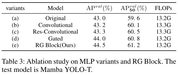 表3:MLP变体和RG Block的消融研究。测试模型为Mamba YOLO-T。