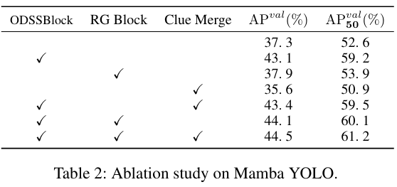 Mamba YOLO消融研究 在本节中,我们独立检查ODSSBlock中的每个模块,在没有Clue Merge的情况下,我们使用传统的卷积下采样来评估Vision Clue Merge对精度的影响。我们在MSCOCO数据集上对Mamba YOLO进行消融实验,测试模型为Mamba YOLO-T。我们的结果表2显示,线索合并为SSM保留了更多的视觉线索,也为ODSSBlock结构确实是最优的断言提供了证据。