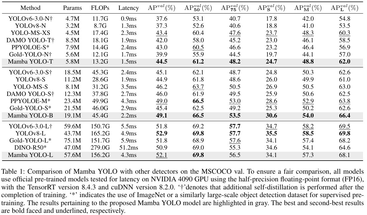 我们设计了一组不同尺度的模型,Mamba YOLO(Tiny/Base/Large),以支持不同规模和尺度的任务部署。在MSCOCO上的实验,如图1所示,表明我们的Mamba YOLO与现有最先进方法相比实现了显著的性能提升。