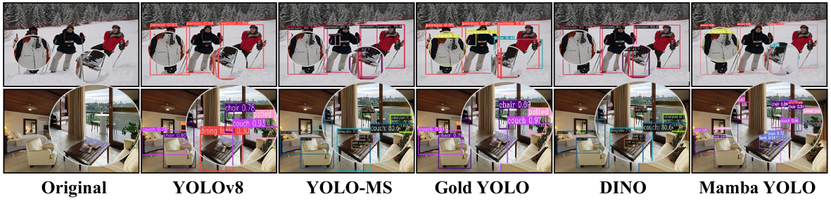 可视化 为了进一步确认我们提出的检测框架的优势,我们从MSCOCO中随机选择了两个样本,图5显示了每个主流检测器与Mamba YOLO的可视化结果,可以看出Mamba YOLO能够在各种困难条件下实现准确检测,并在检测高度重叠、严重遮挡和复杂背景下的物体方面表现出强大的能力,同时也显示出在检测高度重叠和严重