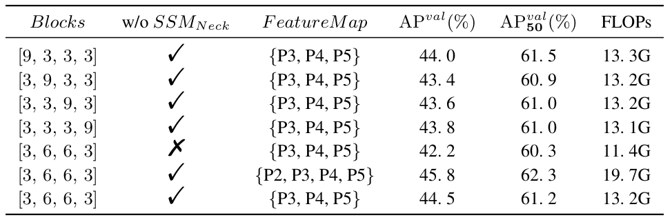 表4:Mamba YOLO变体数值设置类型的消融研究。Blocks表示骨干网络中ODSSBlock的重复次数。✓表示在颈部使用了SSM,✗表示在颈部未使用SSM。在输出FeatureMap大小中,\\scriptstyle{\\mathrm{P}2=20\\times20}, P3=40×40, P4=80×80, P5=160x160。