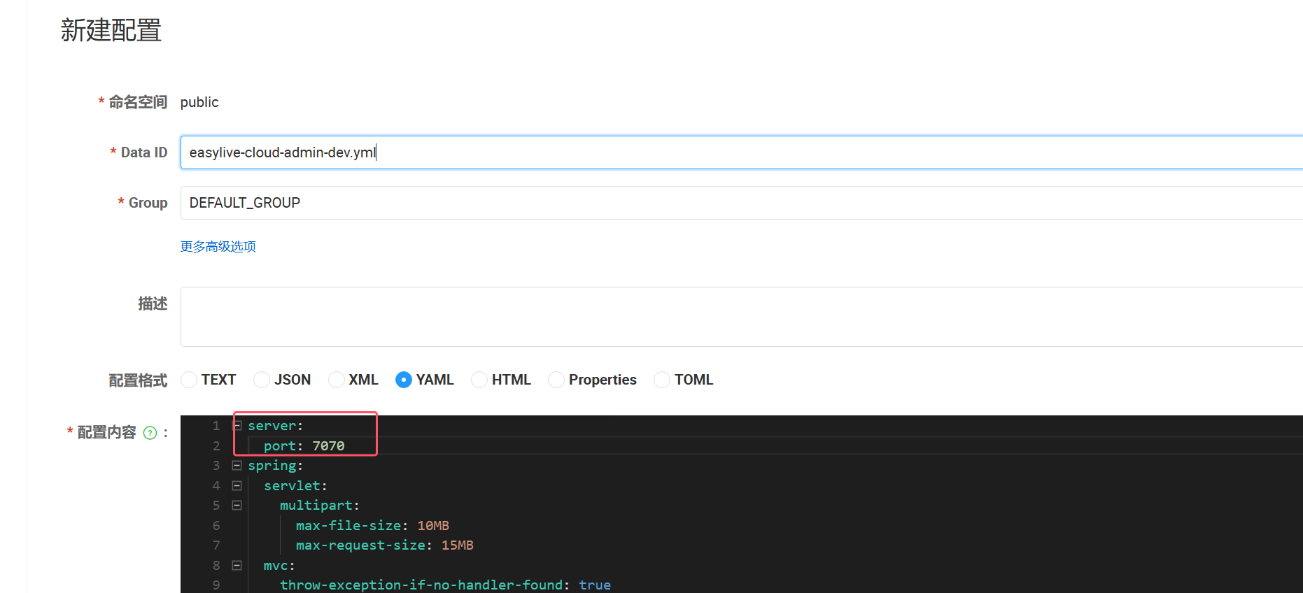 nacos中创建admin配置: