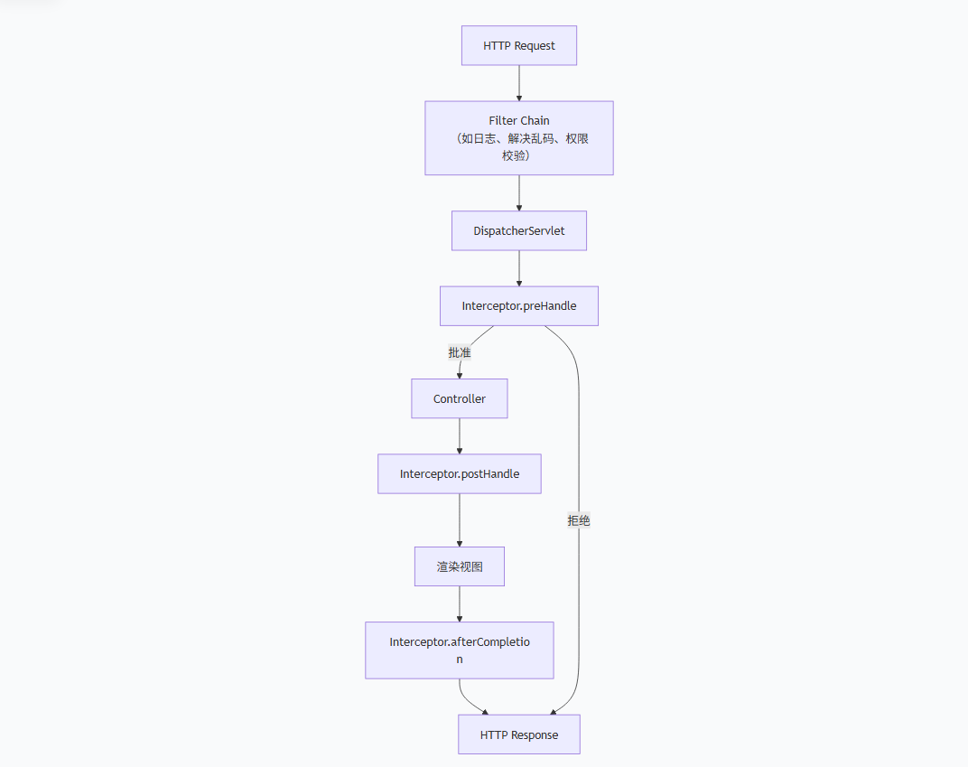 - 拦截器 只需要对进入Spring MVC Controller的请求进行精细控制。Spring框架 的组件,依赖于Spring容器。(楼管)