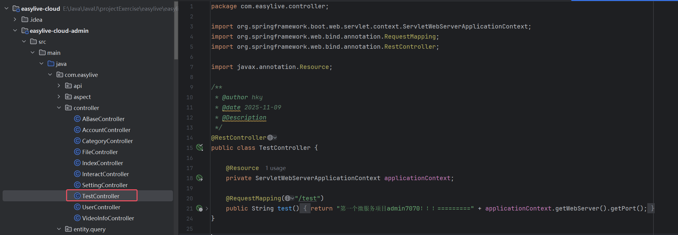 admin微服务创建test接口: