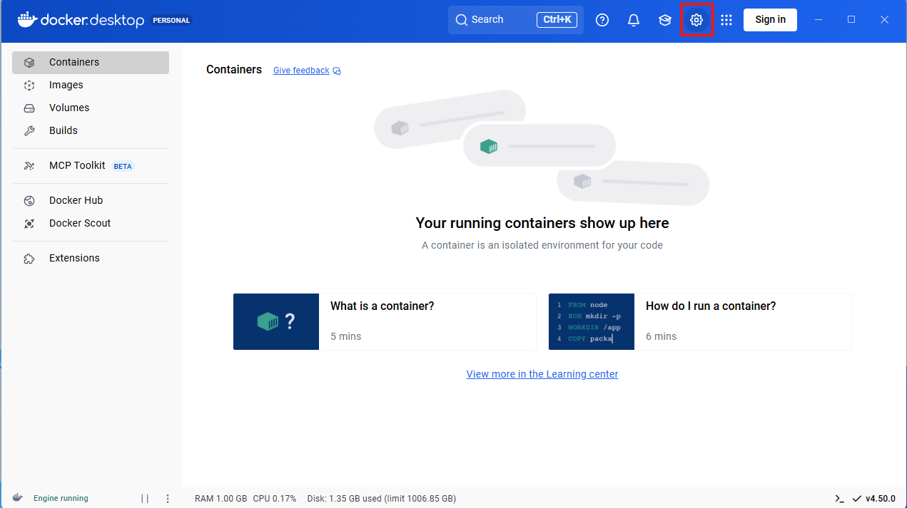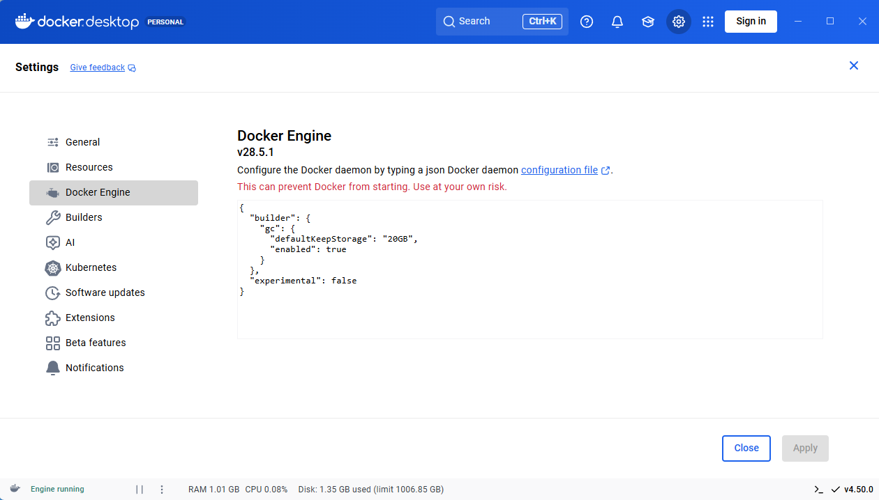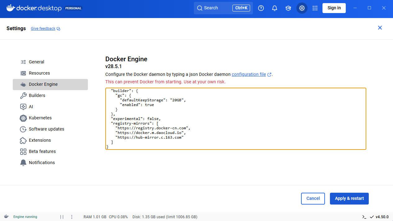点击 Docker Desktop 顶部齿轮 ⚙️ → Settings → Docker Engine