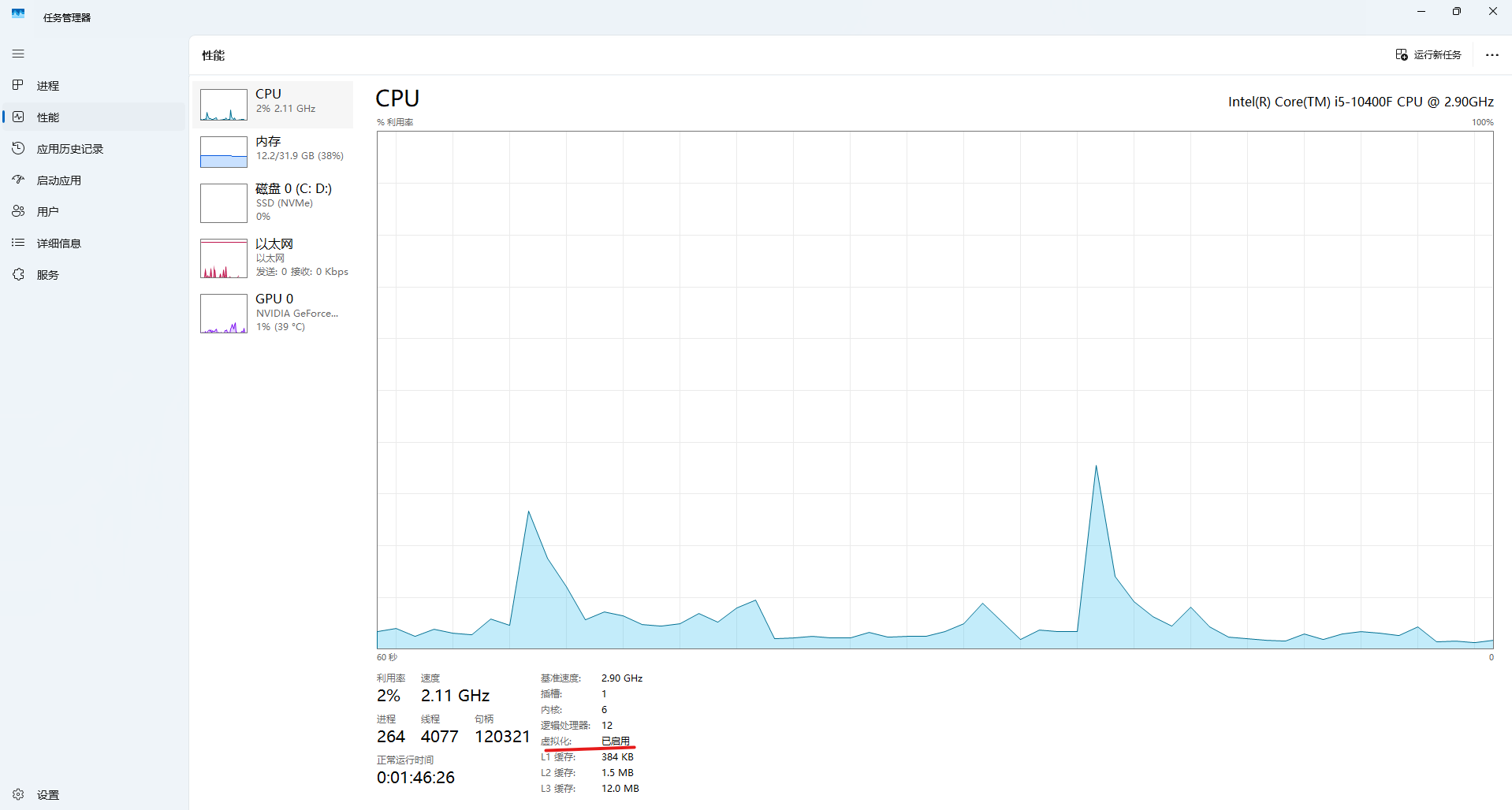打开任务管理器 → 点击「性能」→ 选择「CPU」→ 确认"虚拟化:已启用"。