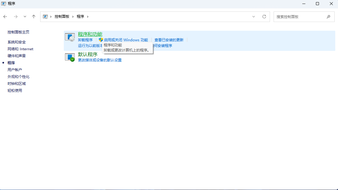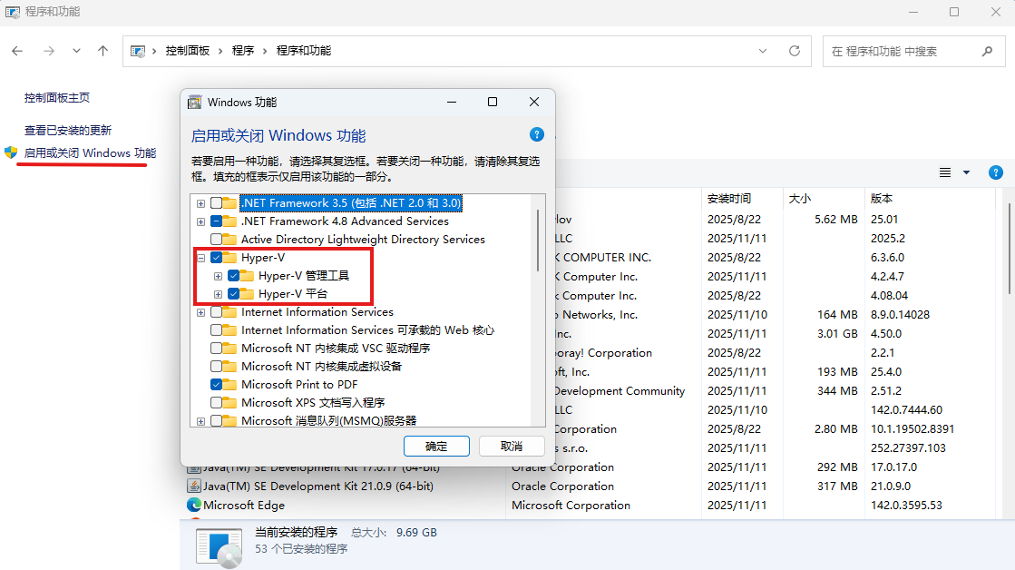 然后,打开控制面板,选择「程序」 →「程序和功能」 →「启用或关闭Windows功能」,选中Hyper-V,确定并重启电脑。