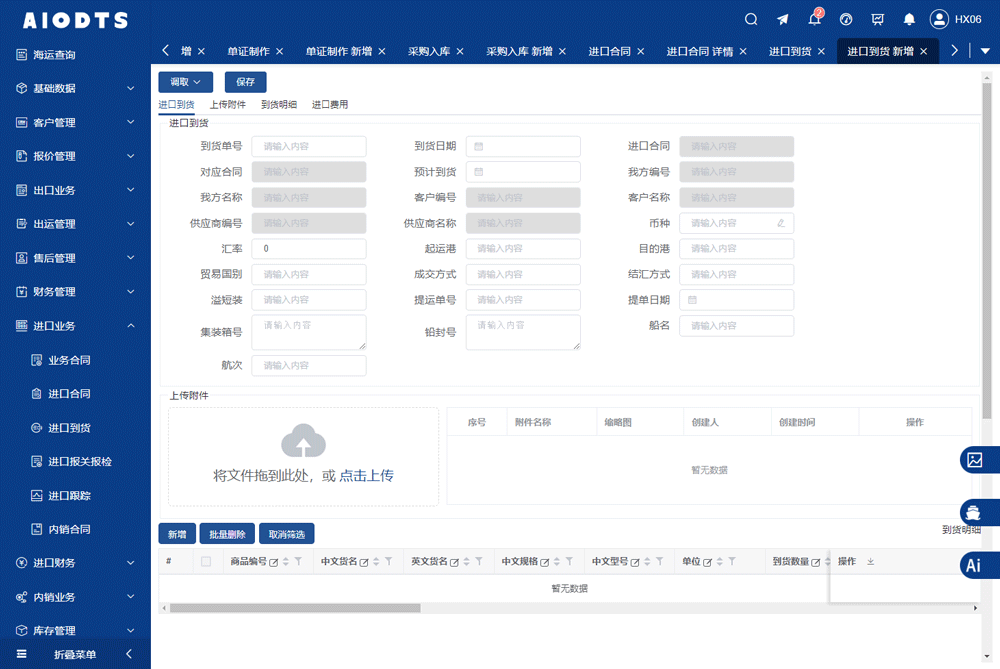 ****2.代理进口业务支持:****针对代理进口业务,系统可设置代理协议模板,自动计算代理费用。支持多家下游客户分配,实现一批进口货物对应多个销售合同。